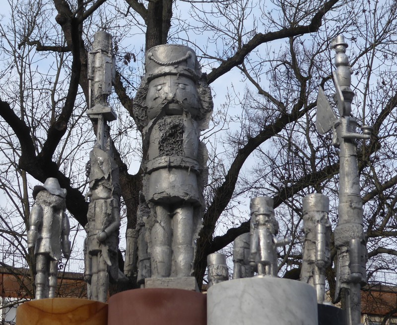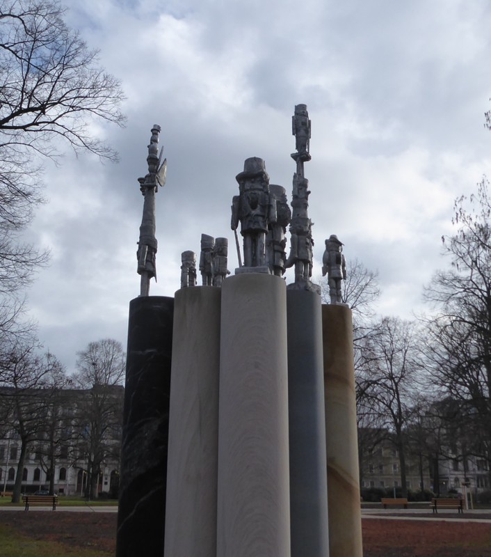 - entworfen von Osmar Osten (geb. 1959), Figuren: Kunstgießerei Gebrüder Ihle (Dresden), Steinsäulen: Bildhauer Christian Späte (Zeitz)
