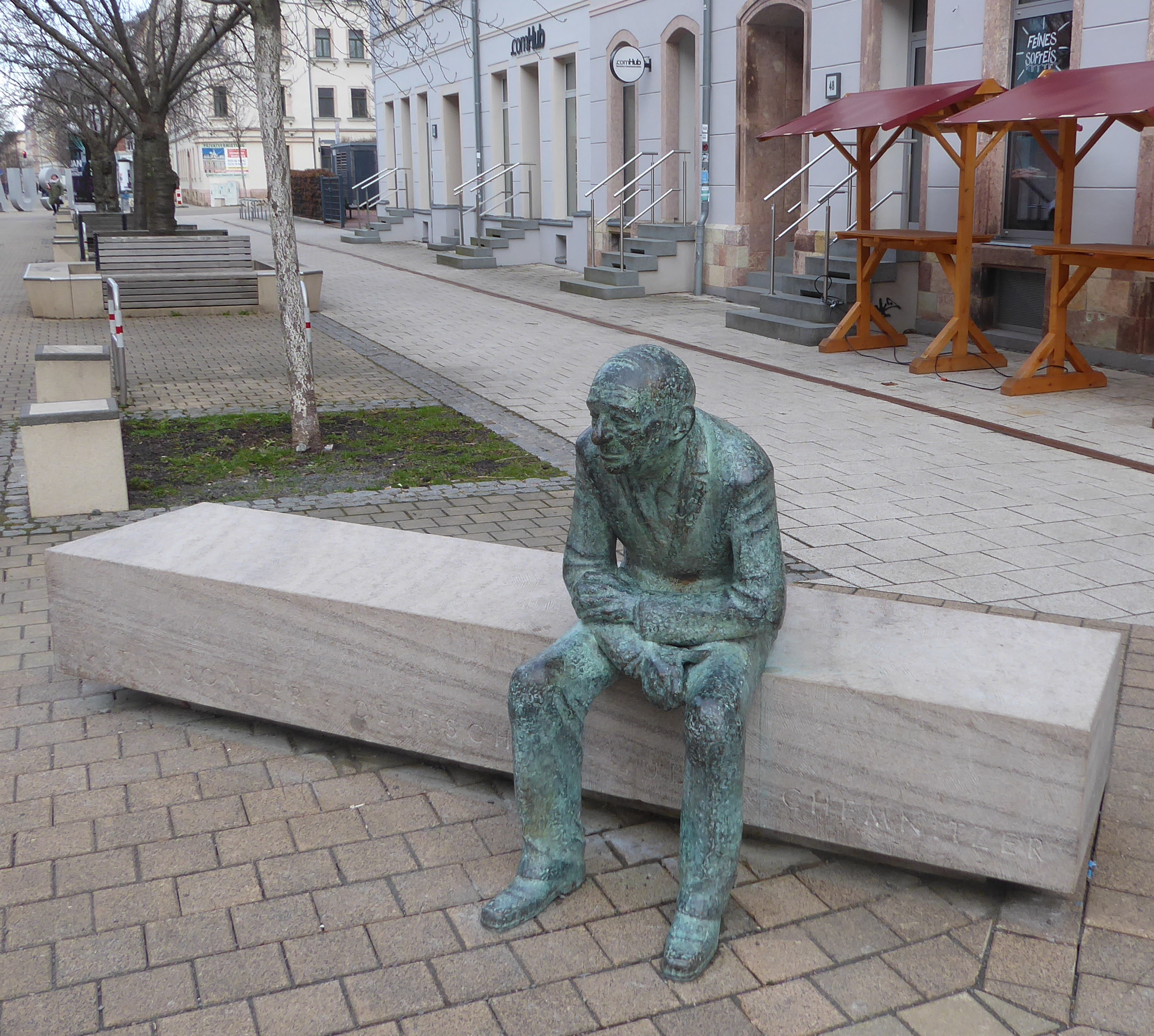 - lebensgroße Skulptur des Holocaustüberlebenden und Chemnitzer Ehrenbürgers Justin Sonder (1925-2020), sitzend auf einer Bank