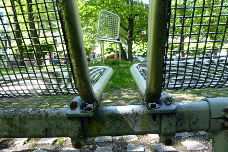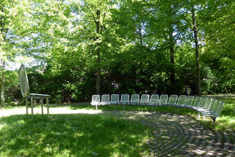 - großer, asymmtrischer / schiefer Stuhl, umgeben von halbkreisartiger Bank, bestehend aus Einzelstühlen