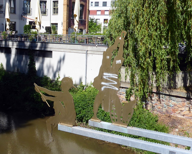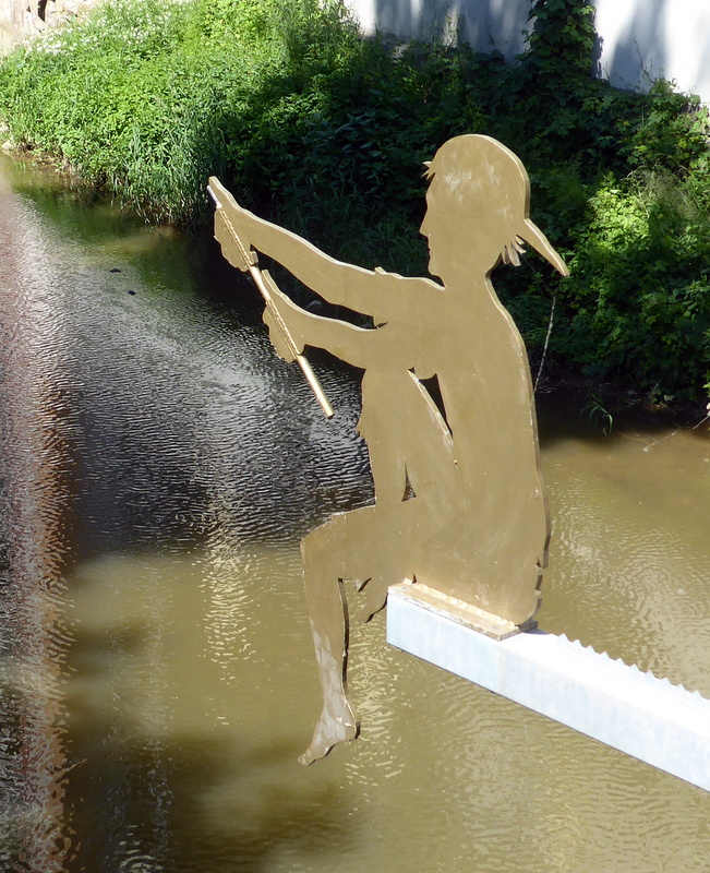 - zwei Angler (Kinder), Flachfiguren, eine im Handstand, eine sitzt und angelt, mit Fisch im Korb und Fisch an der Angel (dieser fehlt)