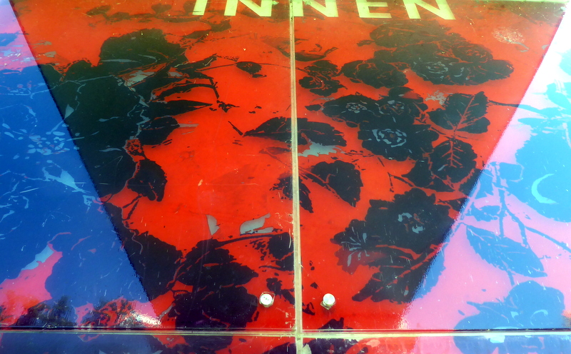 - Beton, grau/rot gestrichen, innen mit angedeuteter Wohneinrichtung bzw. floraler Wandgestaltung