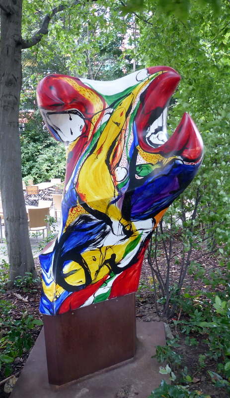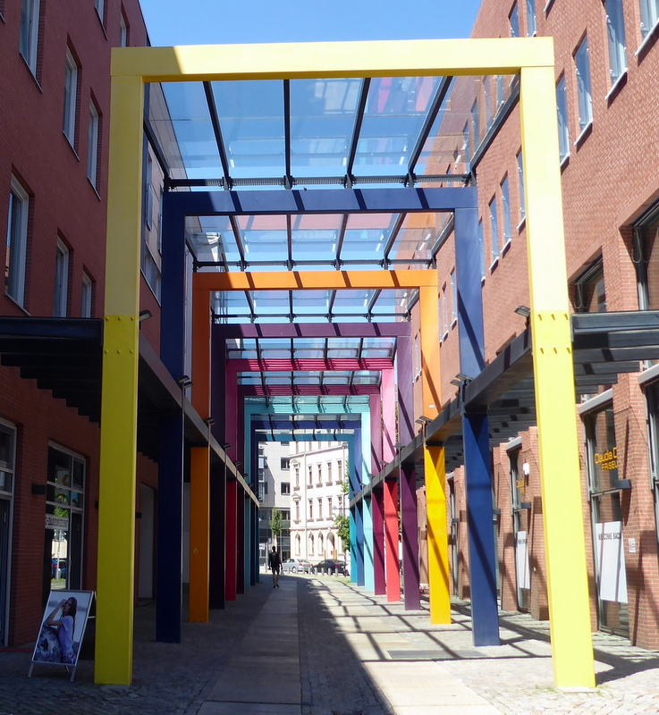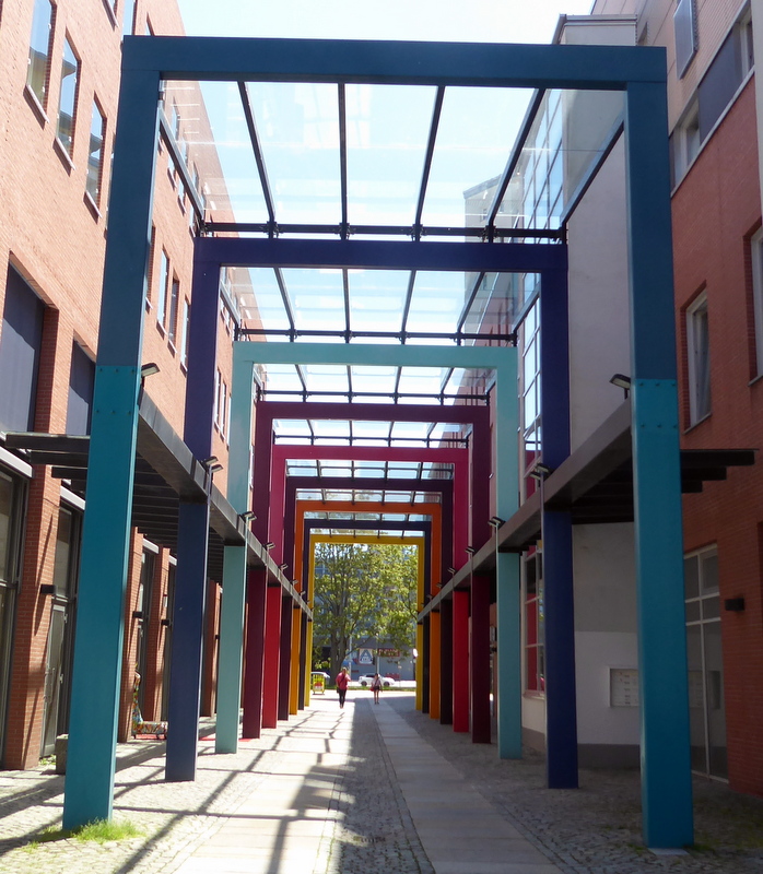 - neun große, farbig gestaltete Bügel über die Fußgängerpassage, sie tragen ein Glasdach, das zwei Gebäude verbindet