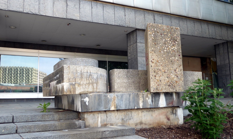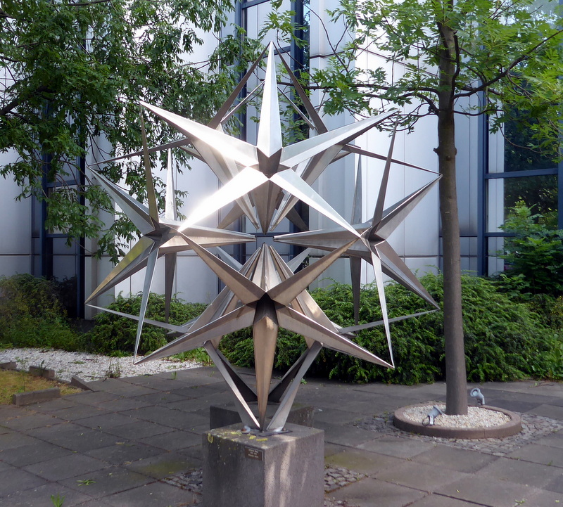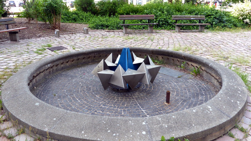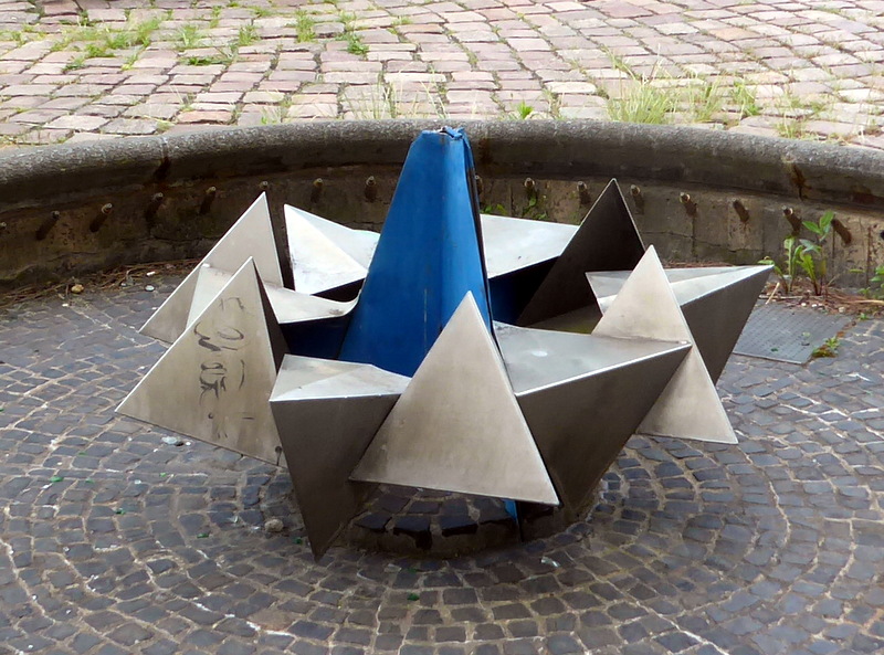 - mehrere geometrische Körper in Pyramidenform gegensätzlich angeordnet, als Kranz in rundem Betonbecken